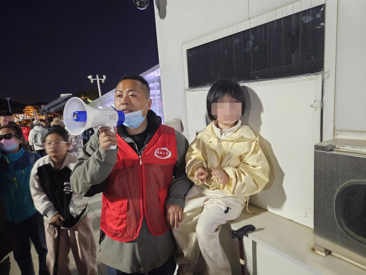 據(jù)了解,19時許,志愿者王路路和其他志愿者在樞紐站維護(hù)乘車秩序時,發(fā)現(xiàn)一名身著米黃色外套的小女孩獨自站在角落哭泣。王路路立即上前安撫,得知孩子與父親下山后不慎走失,他試圖詢問孩子父母的聯(lián)系方式以便快速尋找,但由于孩子年齡太小,記不住父母手機(jī)號。于是,王路路通過廣播尋人,并撥打110報警尋求幫助。在尋找過程中,他不忘輕聲安慰小女孩:“小朋友不哭,叔叔幫你找爸爸,爸爸很快就來啦!”在志愿者的安撫下,孩子逐漸平靜下來。